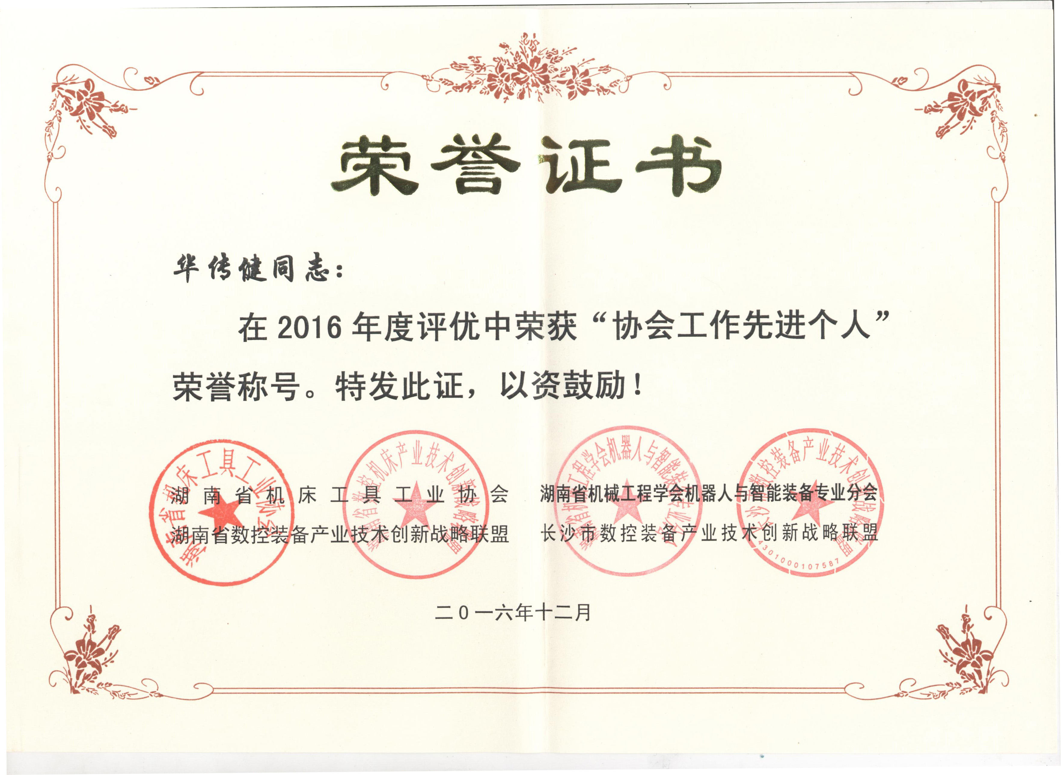 2016年12月28日,湖南省机床工具工业协会、湖南省机械工程学会机器人与智能装备专业分会、湖南省数控装备产业技术创新战略联盟和长沙市数控装备产业技术创新战略联盟在湖南省沅江市与市人民政府共同主办了2016年工作年会。公司董事长华传健先生、技术部经理陈奇志先生,华凯机电总经理饶治国先生及西门子PIM产品经理黄欢先生参加了会议,会议邀请了西门子公司工业4.0方案推广经理陈文江先生作了“机床设备的智能制造”主题演讲。会上,华传健先生荣获2016年度“协会工作先进个人”荣誉称号。